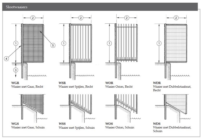 Naast maatwerk sierslootwaaiers leveren wij ook standaard slootwaaiers. Deze zijn verkrijgbaar in vier verschillende vullingen: