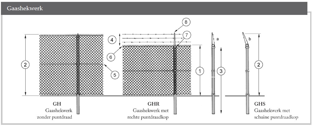 Al onze gaashekwerken zijn voorzien van harmonicagaas en verkrijgbaar in grijs, groen of zwart. In de afbeelding hieronder ziet u de technische verschillen per uitvoering.